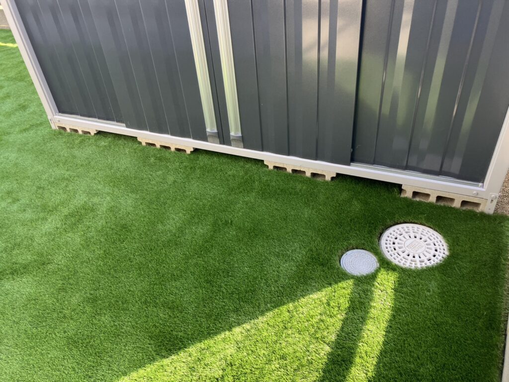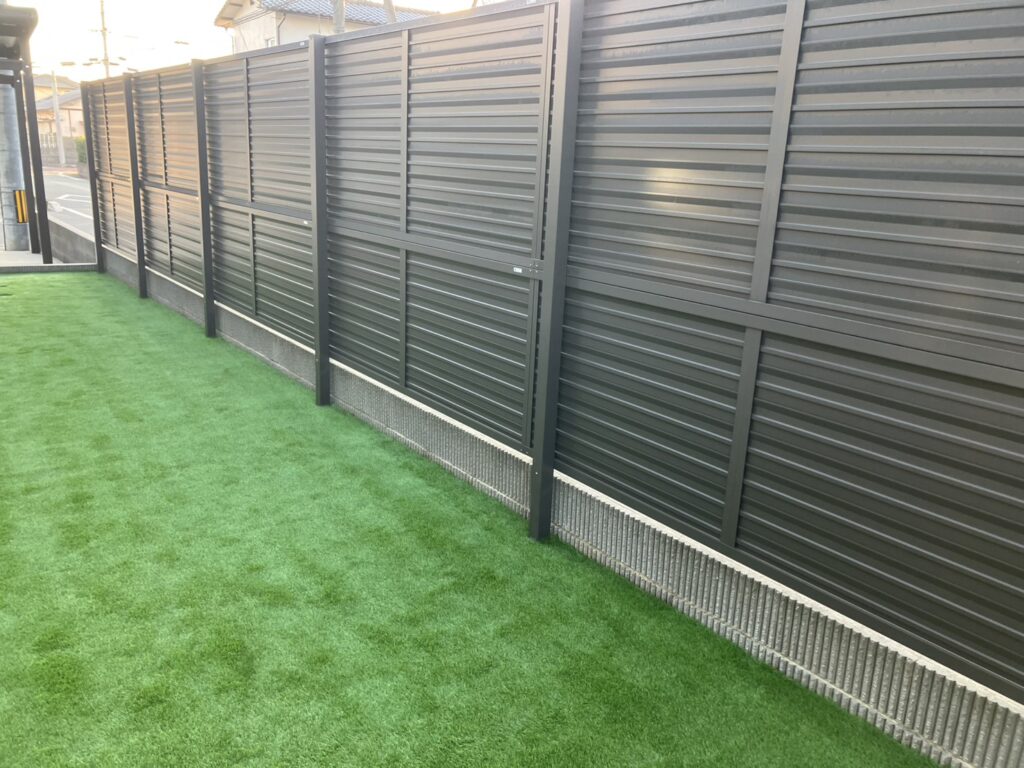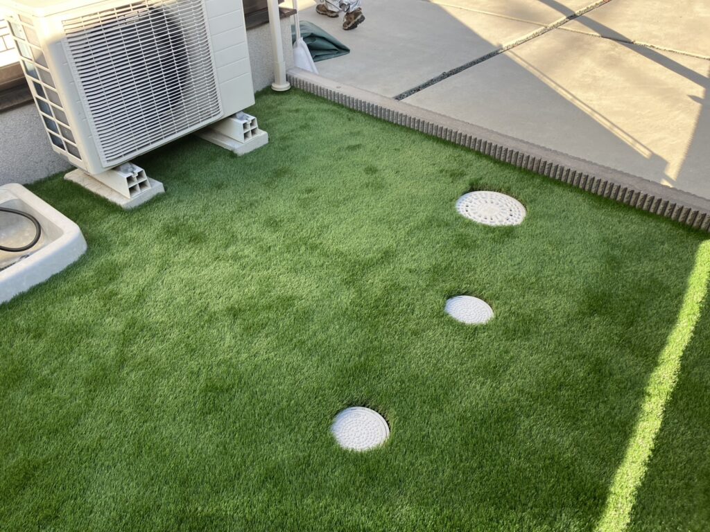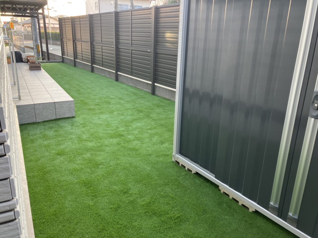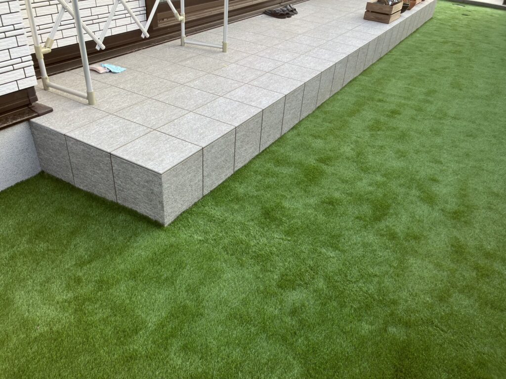 フェンスの下、タイルデッキ周りと人工芝は相性抜群ですね🛠️